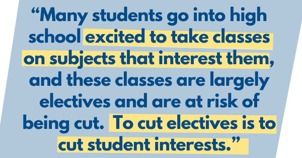 There are only six (that is a one-digit number) of these classes at our school, and all six of these classes are electives and are at risk of being cut from the program of studies if there isn’t money to fund them. Many students go into high school excited to take classes on subjects that interest them, and these classes are largely electives and are at risk of being cut. To cut electives is to cut student interests.